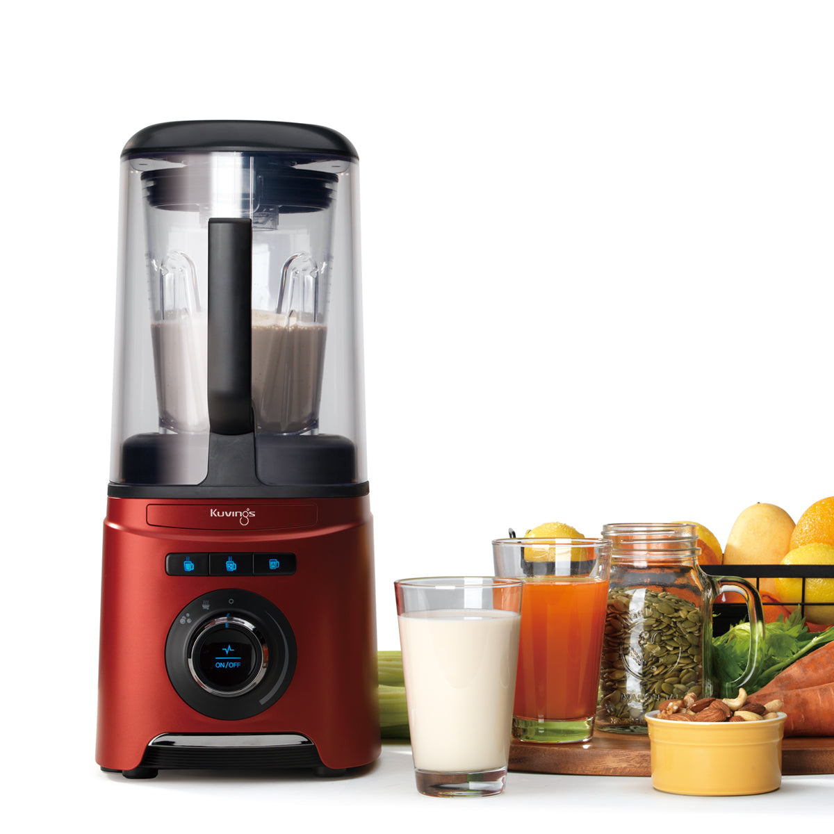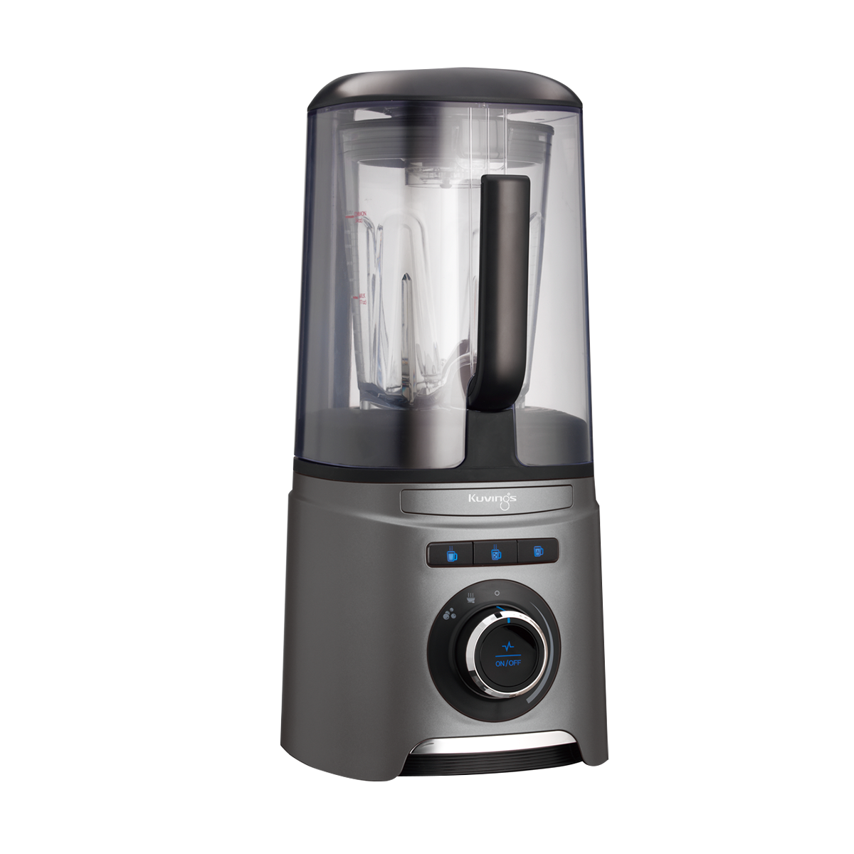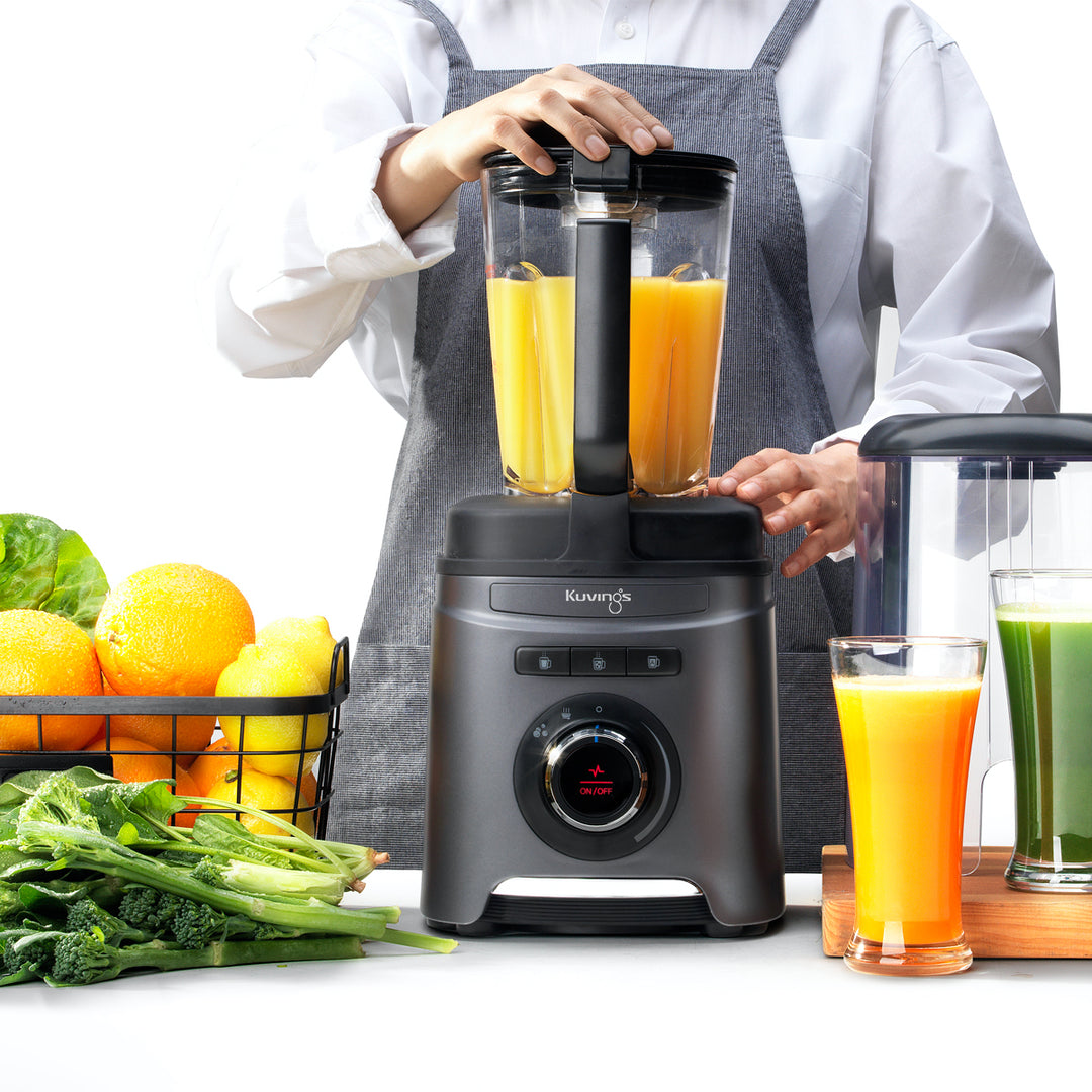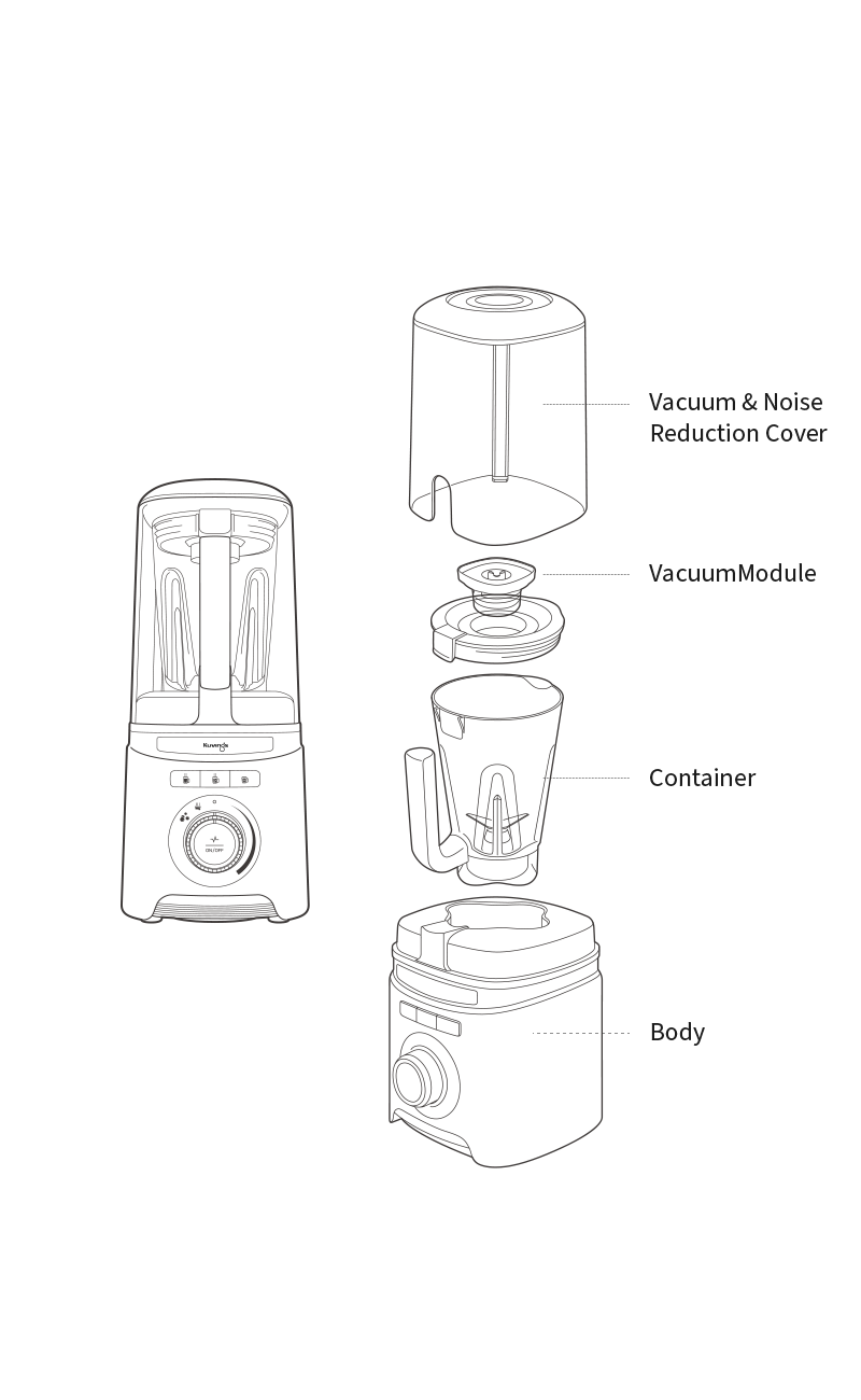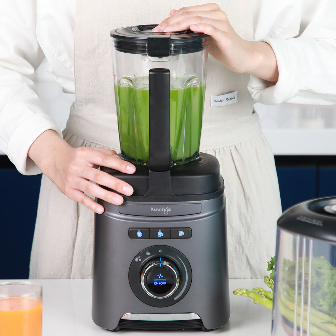 Kuvings' Vacuum Blender Elegance. Blend in silence with noise reduction cover. Savor richer flavors, thanks to reduced oxygen. Elevate dishes with Vacuum Tumbler's heat magic. Convenience reigns with pre-programmed buttons and auto cleaning. Safety's embrace with the sensor's watchful eye. Stay cool with the air cooling system.