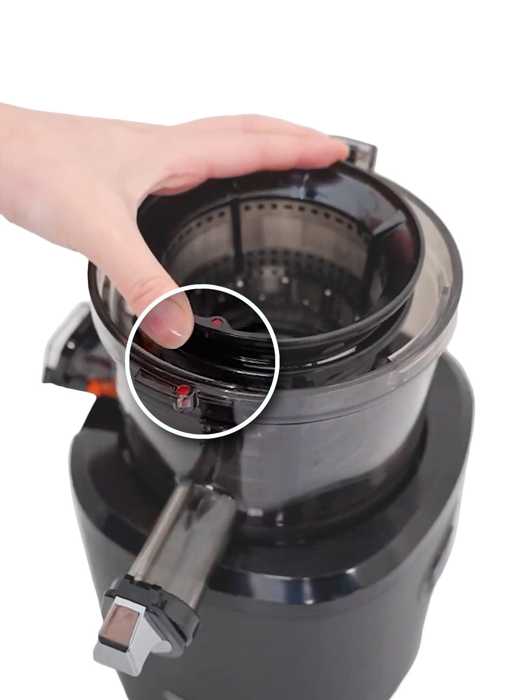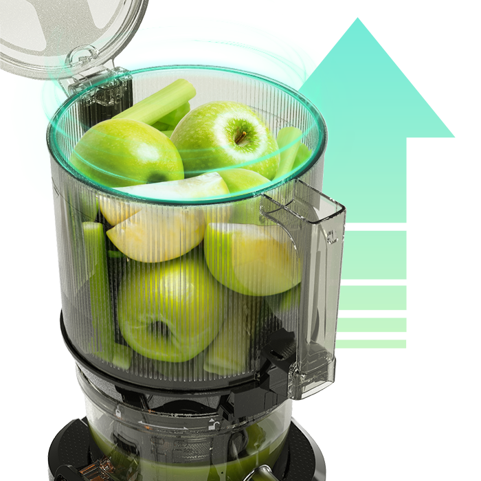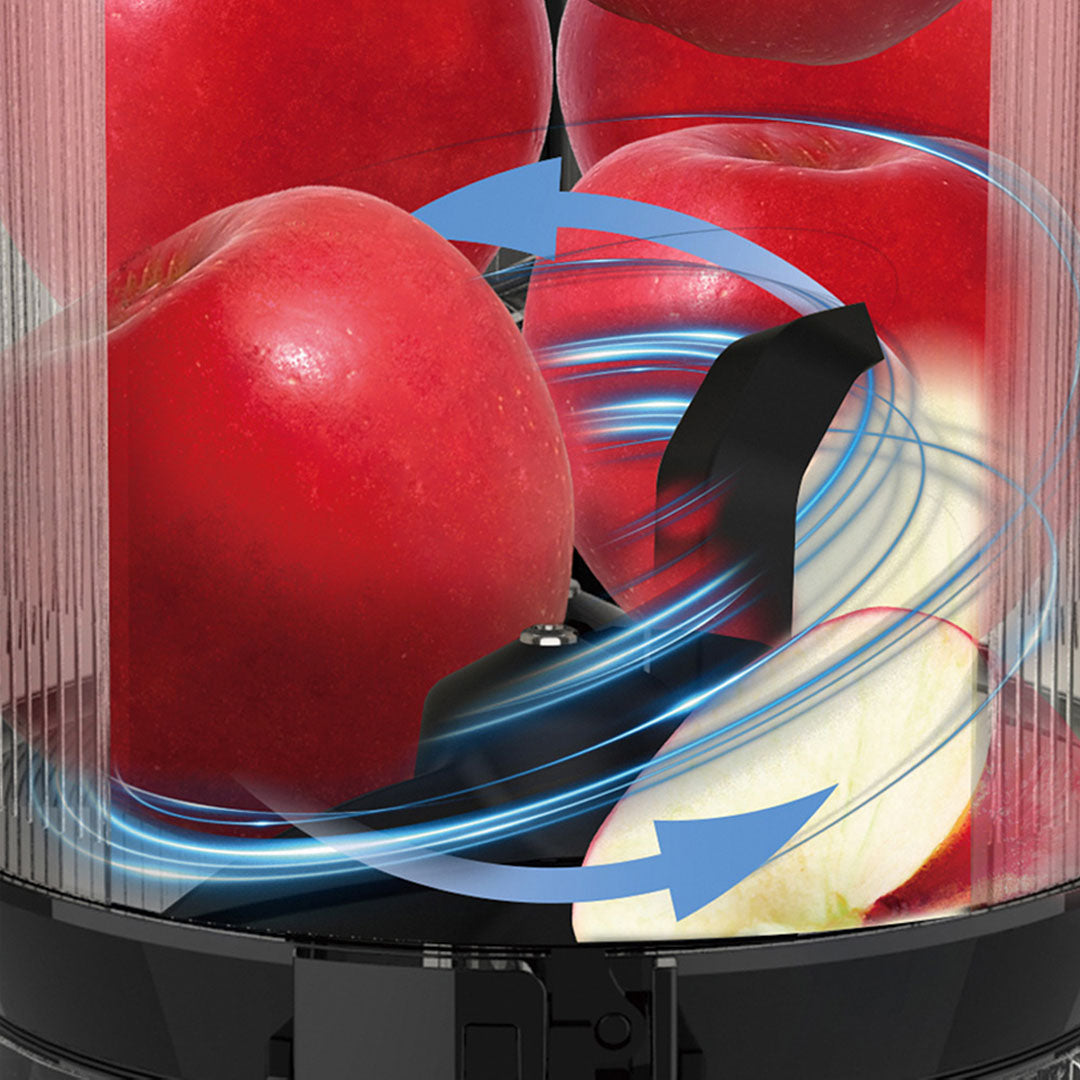 By employing an automatic cutting mechanism , the double shredding blade of the upper container is designed to automatically cut all input material and quickly transport the cut material to the juicer.