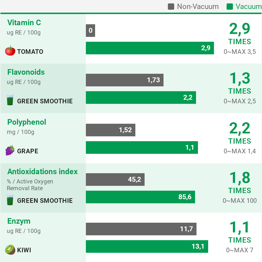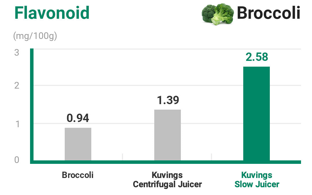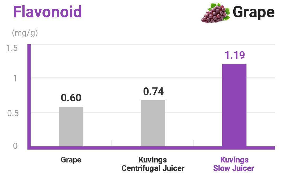 Flavonoid: Juice from a slow juicer contains 1.5 times more flavonoids than fruit and juice from a centrifugal juicer.