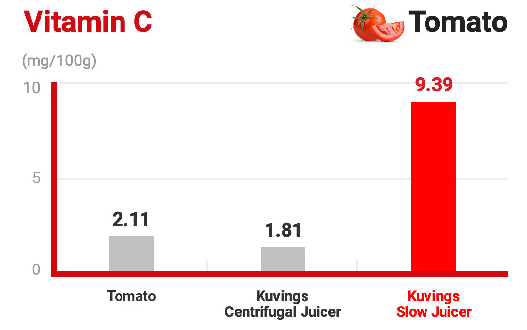 The vitamin C content in juice prepared with a slow juicer is 5.2 times higher than the vitamin C content in juice prepared with a centrifugal juicer. Oxidation is another reason for the lower vitamin C content.